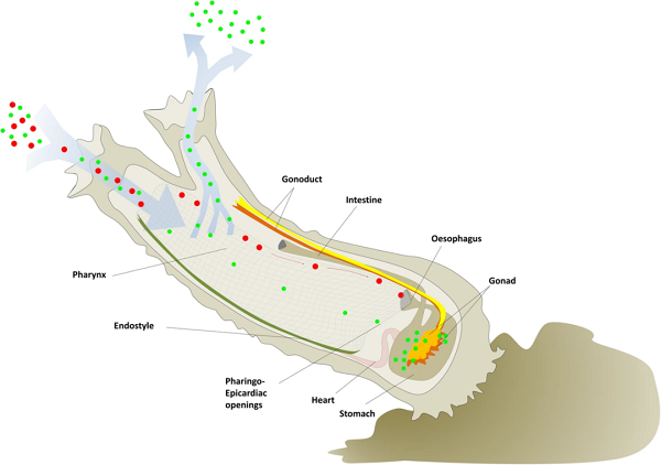 图示为成年被囊动物C.Robusta体内的水循环过程。红点表示较大的颗粒,绿点为较小的颗粒,这些颗粒可能包括纳米塑料,有时会从被囊动物体内排出或聚集在生殖腺(生殖腺)内。