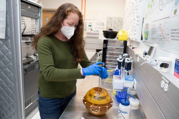 NIST工程师Katy Keenan打开了Phreddie,这是一个校准磁共振成像仪的模型,可追溯到标准化值。这个模型装满了模拟各种人体组织的盐溶液小塑料容器。