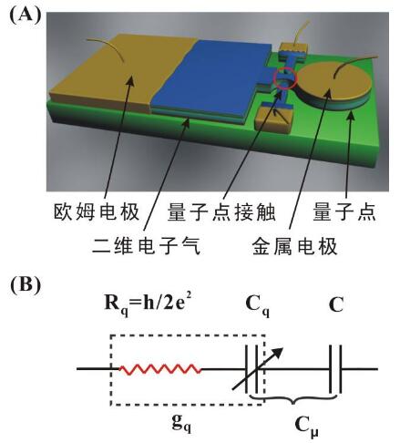 即“介观电容决不是由其极板几何尺寸决定的古典电容”,而是存在“量子电容”,它与“几何电容”相串联。“量子电容”起源于作为电容极板之一的“量子点”,且与它的电子能态密度成正比,因而依赖于系统的电子能级分布。它实质是电容电荷在量子点与电子库间运动的弛豫电阻。在单通道传播时其量子点接触的电阻,即不依赖电子穿过散射区的透射率 D, 却始终为一常量 h/2e2。