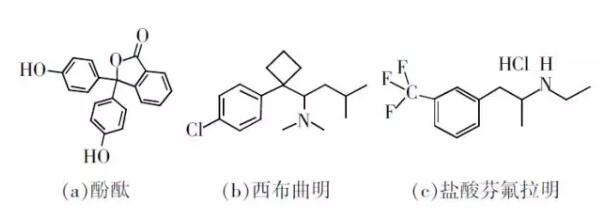 酚酞属刺激剂,用于慢性便秘,长期使用可损害肠神经系统,且很可能是不可逆;西布曲明为非苯丙胺类食欲抑制剂,通过抑制人的食欲达到减肥的效果,但会增加严重的心脑血管不良事件;芬氟拉明为苯丙胺类食欲抑制药,会导致心脏瓣膜病变等不良反应。