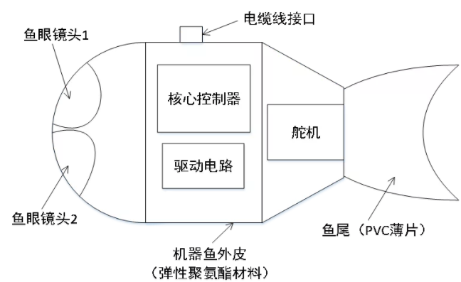 机器鱼的基本结构分为三部分:头部(包括鱼鳍),身体,尾部。鱼鳍只控制鱼的向前游动,而身体是鱼的主要部分,控制电路及电机和相关驱动电路都在其中;尾部可以分为两部分,都是进行左右摆动,这两部分都是通过电机控制的连杆来操控的。