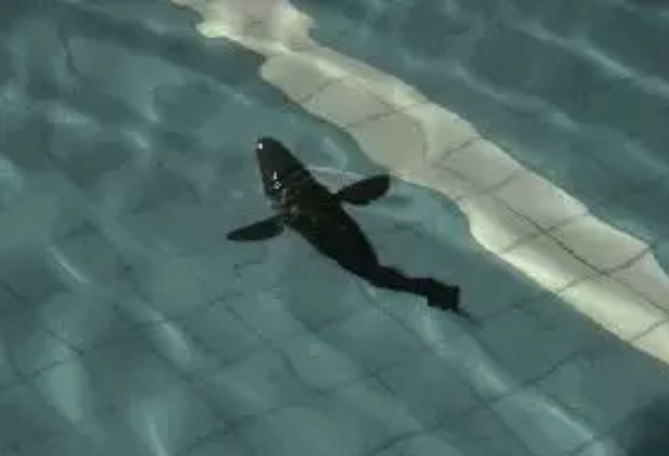 机器鱼唯一的动力来自尾巴,这片尾巴,由后部伸出的一只机械臂带动。机械臂由大臂和小臂组成,位置有点像尺骨与桡骨。它们分别接到两只电机上,做不同运动。尽管构造简单,合起来就可能构成复杂的动作。可以想象一只拿着扇子的手——肘关节也可以扭动,腕关节也可以扭动。机器鱼模仿的是鱼或海豚的动作,鱼和海豚尾巴的划水动作看似简单,其实需要专门的仿生学研究其轨迹,得出相应的算法,好指挥机械尾巴运动,做到尽量平滑。