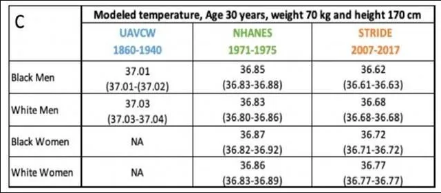 研究人员通过对数据采用建立线性模型等手段进行对照分析,最终发现:19世纪初期出生男性的平均体温比现在的男性高0.59°C,每10年大约降低0.03°C;自19世纪90年代以来,女性的体温也下降了0.32°C,每10年大约降低0.029°C。总体而言,相当于平均每十年体温下降了约 0.03°C。