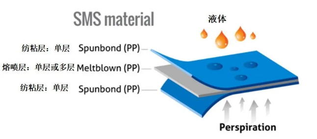 口罩的原料全部为聚丙烯(Polypropylene,简称PP),医疗用口罩一般都是多层结构,一般简称为SMS结构,具体见示意图4[1]。