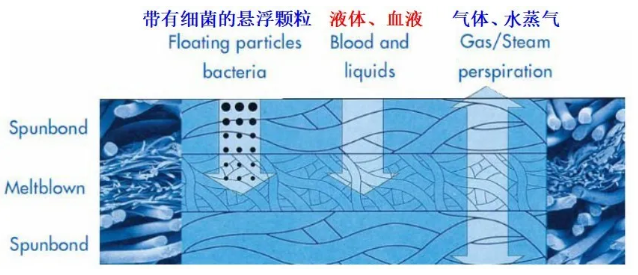 图5中的纺粘层(Spunbond),其纤维直径比较粗,在20μm左右,2层S纺粘层主要作用是支撑整个无纺布的结构,对阻隔并没有太大的作用。口罩最重要的是阻隔层或熔喷层M(Meltblown),熔喷层的纤维直径比较细,在2μm左右,只有纺粘层直径的十分之一,这个对防止细菌、血液渗透起至关重要的作用。