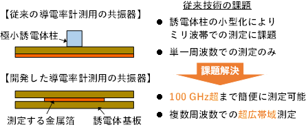 在高频电路中,整个电路的传输损耗是由介质基板的介电损耗和导体损耗决定的,而导体损耗是由金属线的导电率决定的。虽然电介质的表面经过了粗化处理,以保持金属和电介质之间的粘附力,但在毫米波波段,粗化会导致电导率的下降。但是,由于传统的电导率测量需要一个由极小的电介质柱组成的谐振器,而且测量只能在单一的频率下进行,而这个频率是由电介质柱的大小决定的。与此同时,在100GHz以上的频段内测量金属电导率的简单技术还没有建立起来。在本研究中,研究员开发了一种电磁场分析算法,可以根据其高阶模激励的共振特性的尖锐度,精确地测定夹在金属箔和电介质基体之间的电介质谐振器的电导率,并成功地测量了从10GHz到100GHz以上超宽频段的金属电导率。在广泛的应用范围内,实现了与传统技术同等精度的简单易行的测量技术。新研发的技术有望加速5G和6G低功耗先进材料的发展。