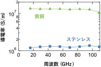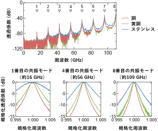 图5上半部分显示了由已知电导率的参考铜盘和待测金属盘(黄铜和不锈钢)组成的谐振器中高达110GHz的谐振波形。由于平衡盘谐振器的超宽模式选择性,证明只有某些谐振模式,在所有谐振器中以相等的间隔出现。通过测量约16GHz的基模共振和约13GHz间隔出现的高模共振的共振特性,确定了每个共振频率下的电导率。由于谐振器的供电机构所使用的同轴线的特性,可以输入到谐振器中的信号频率被限制在110GHz,所以本研究将测量范围限制在110GHz。另一方面,研究通过使用超细同轴线来测量介电常数,演示了一个可以输入信号到170GHz的谐振器,现在研究院也在尝试开发更高频率的电导率测量。
