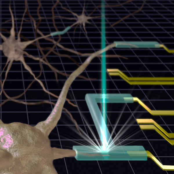 图片:一个预期的生物相容性界面图示表明,可以通过电子束或X射线束将3D打印过程生成的水凝胶(绿色管)充当人工突触或连接点,将神经元(棕色)连接到电极(黄色)。