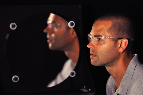 在这张自拍中,Staymates坐在一个球形凹面镜前,凹面镜是纹影成像系统的一部分,用来制作气流视频。