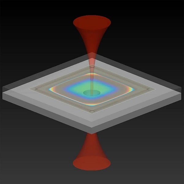 利用光测量加速度的光机加速度计如图所示。NIST设备由两个硅芯片组成,红外激光从芯片底部进入,从顶部射出。芯片顶部包含一个由硅梁悬挂的质量块,使质量能够根据加速度的变化上下自由移动。质量块上的镜像涂层和附在芯片底部的半球镜形成光学腔。选择与腔体的谐振波长相匹配波长的红外光,使光在两个镜像表面之间来回反射多次后,增强强度。当装置检测到加速度变化时,质量块移动,改变空腔长度并移动谐振波长,这会改变反射光的强度。光学读数将强度的变化转化为加速度的测量。